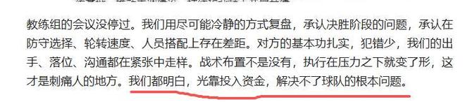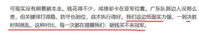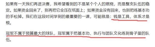 这位作者认为光靠投入资金,解决不了球队的根本问题。他更是认为砸钱买不来冠军。直言钱是工具,体系才是根。冠军不属于预算最大的球队,冠军属于把基本功、执行与团队文化练到骨子里的队伍。