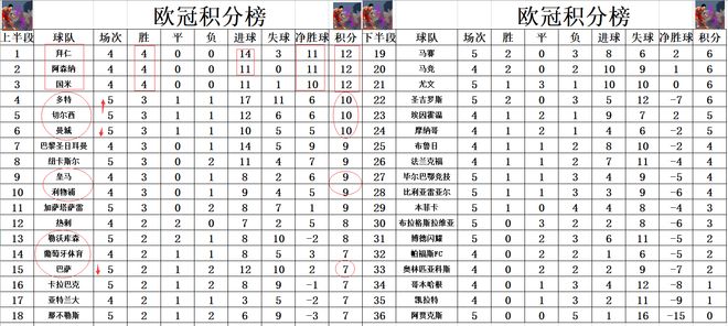 积分榜方面,目前还有3支球队保持全胜,拜仁进球优势力压阿森纳领跑,国米1个净胜球之差排在第3。切尔西今天大胜巴萨后,暂时超过皇马,巴黎,并以一个净胜球优势将曼城挤出前4。多特今天大胜黄潜后,进球优势力压切尔西升至第4,巴萨惨败后排名继续下跌,被赢球的勒沃库森超过,跌到第15。